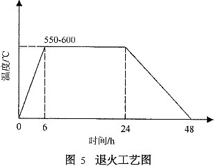殘余應(yīng)力會引起鋼件在使用一定時(shí)間以后,或在隨后的切削加工中產(chǎn)生變形或裂紋。耳軸退火主要用來消除堆焊造成的殘余應(yīng)力、細(xì)化金相組織。采用局部退火裝置:制作一鋼筒,鋼筒內(nèi)、外襯石棉,內(nèi)盤電熱絲;鋼筒一端開口,套在耳軸上開口部與包體焊接固定;退火時(shí)鋼筒四周覆石棉,鋼包內(nèi)耳軸位置覆石棉;對每只鐵水罐退火過程嚴(yán)格按照圖5所示溫度曲線要求。